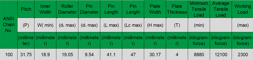 The ANSI #100 roller chain is engineered for heavy-duty industrial power transmission and conveying applications. Manufactured in full compliance with ANSI B29.1, it features a 1-1/4 inch pitch and robust construction to handle continuous high loads with stable, reliable performance.